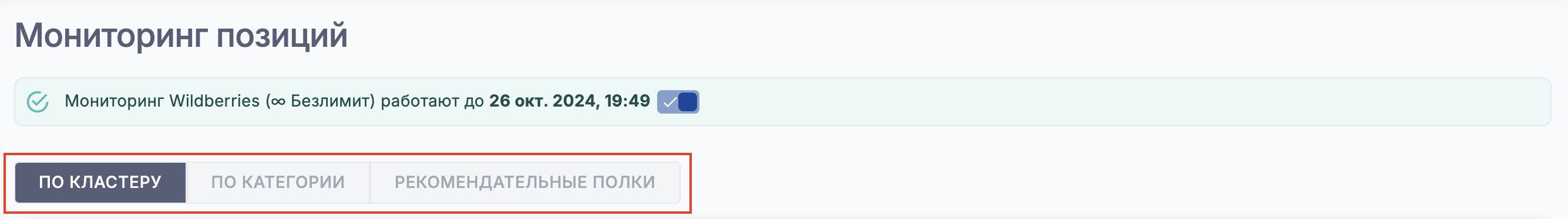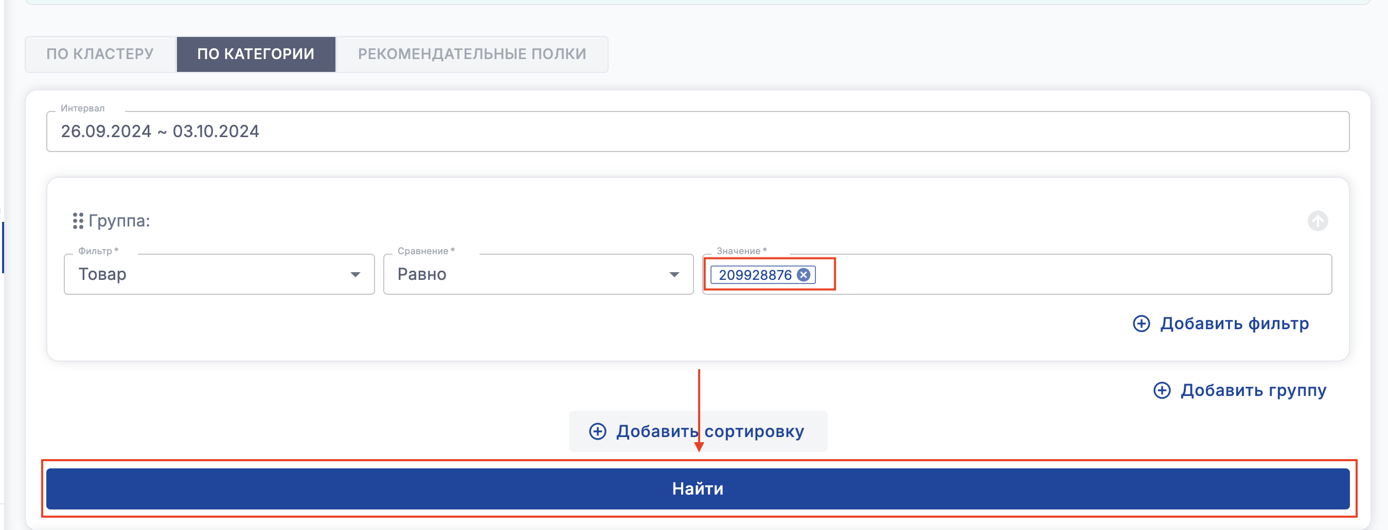 Выберите где вы хотите посмотреть позиции товаров: по кластеру, по категории или в рекомендательных полках