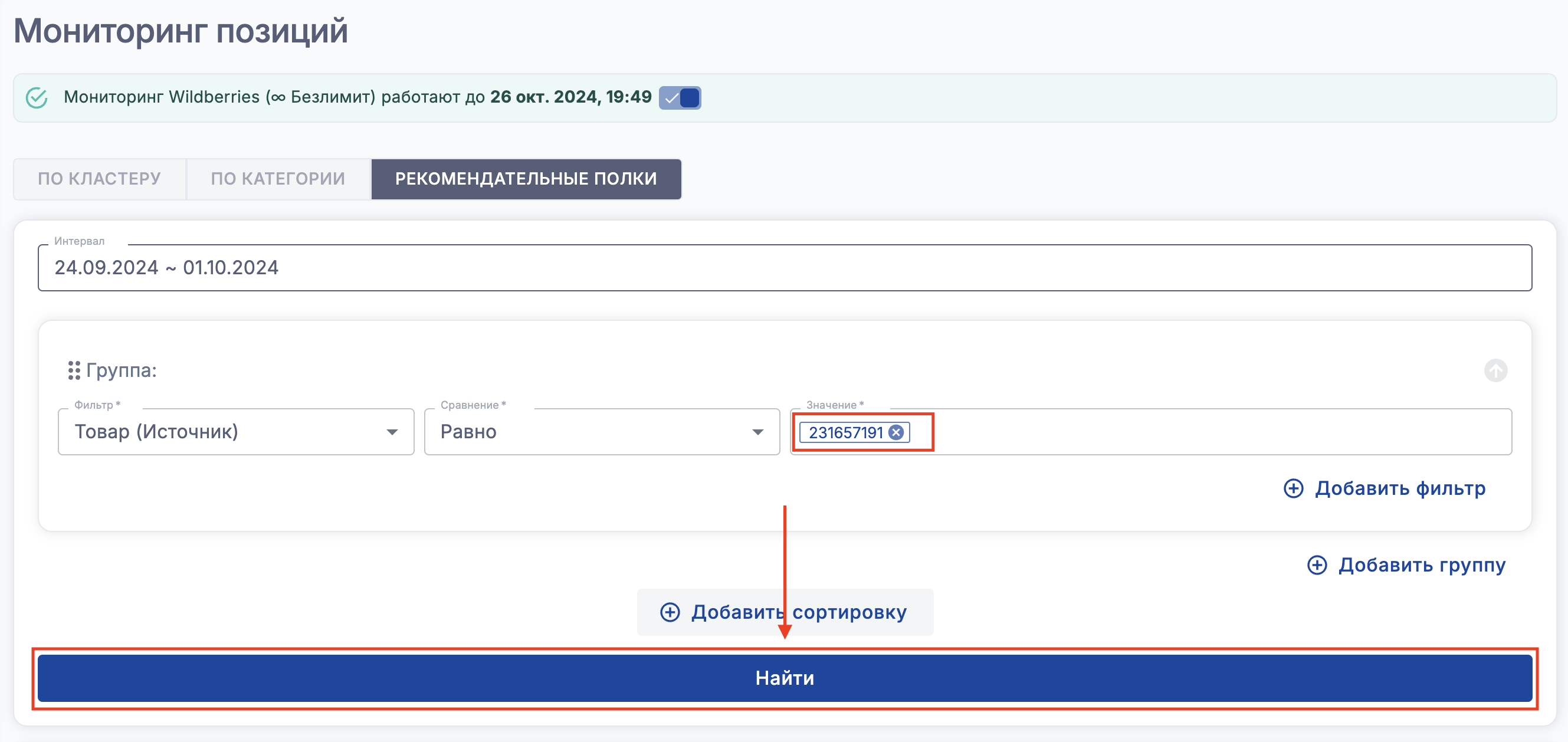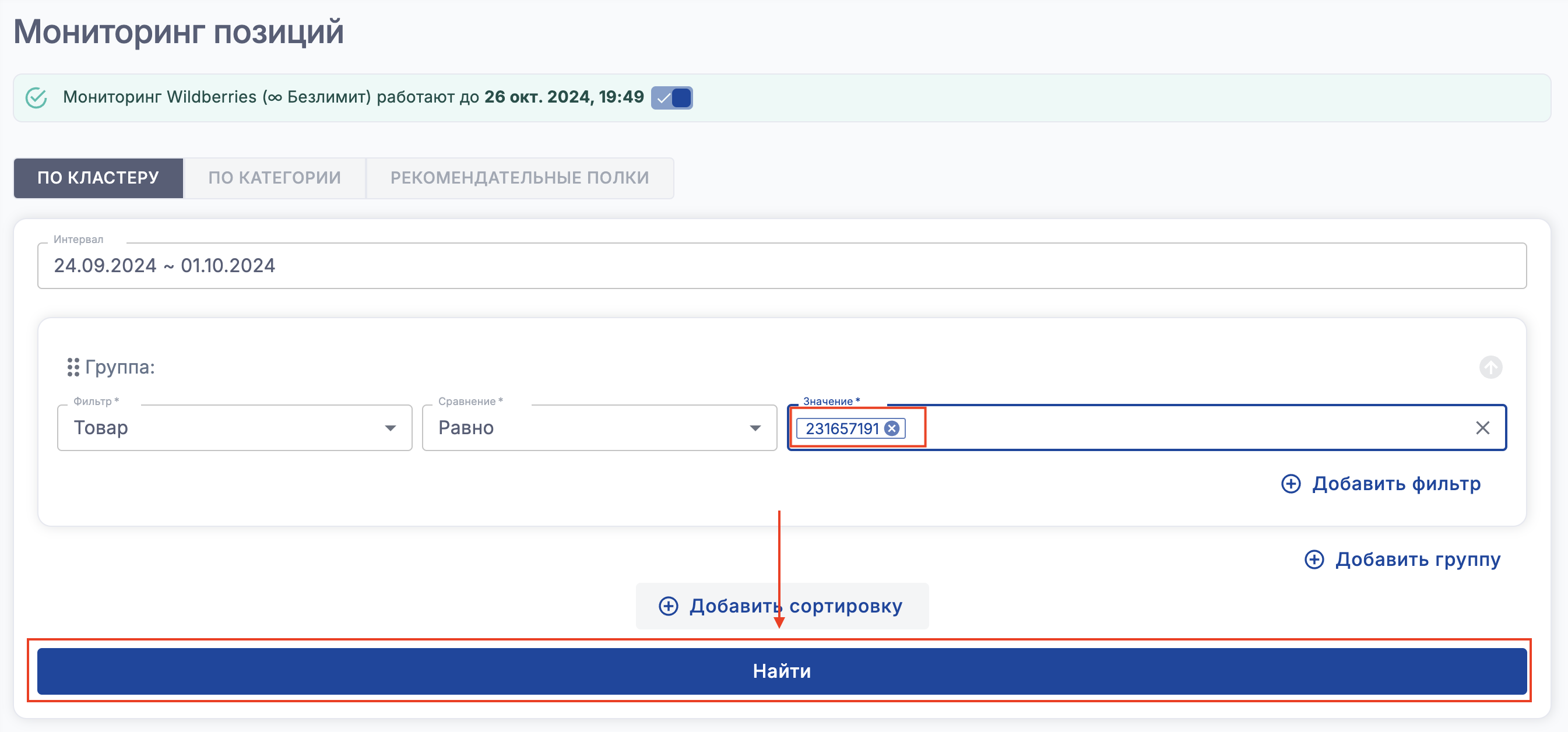 Вам нужно указать артикул товара в котором вы хотите проверить выдачу в поле, нажать Enter и нажать "Найти"