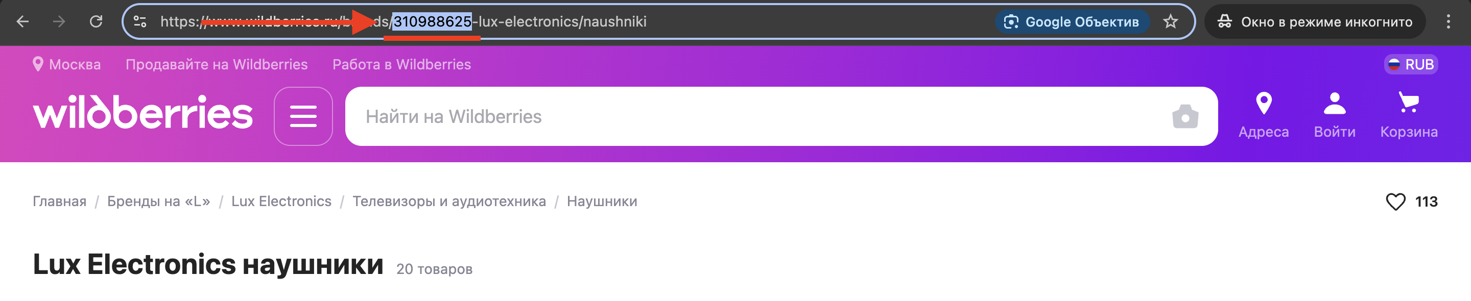 Чтобы получить номер бренда, перейдите на страницу бренда на Wildberries и скопируйте номер из строки браузера