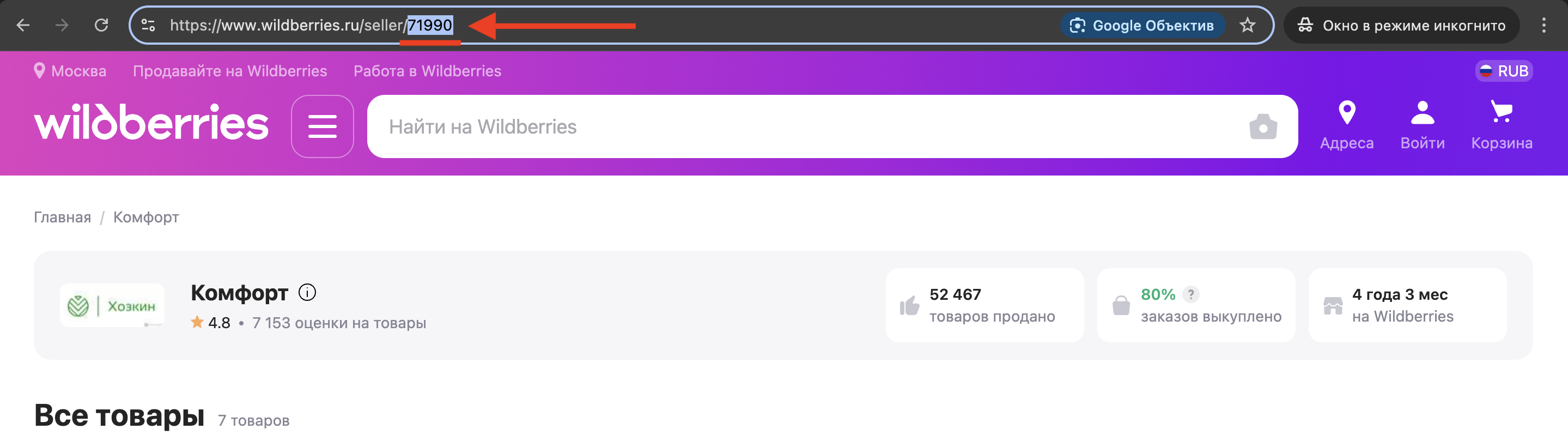 Чтобы получить номер поставщика, перейдите на страницу поставщика на Wildberries и скопируйте номер из строки браузера