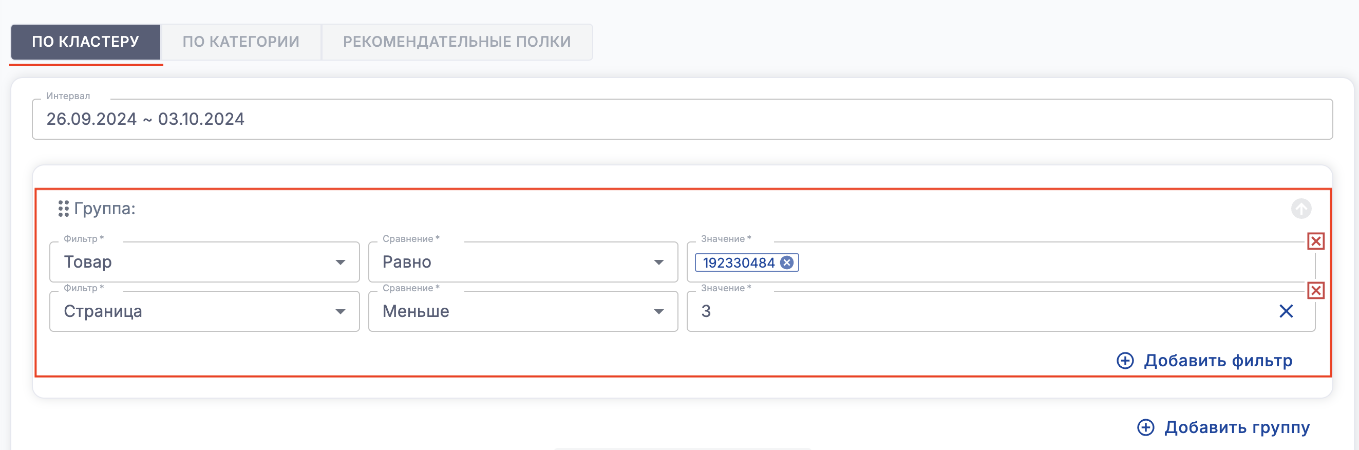 В данном режиме уже выбран готовый фильтр: Кластер - Содержит - ...