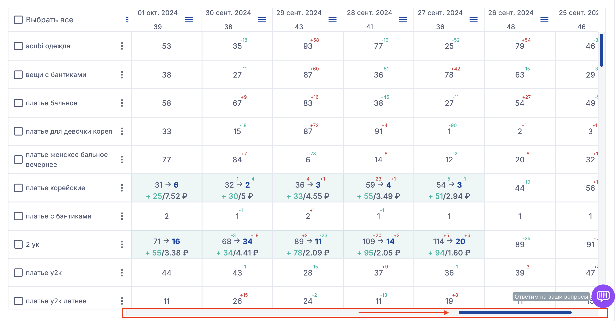 Раздел покажет товары в выдаче по кластеру, а также частотность и динамику частотности ключей, % конкуренции по ключу, историю позиций и другие полезные данные